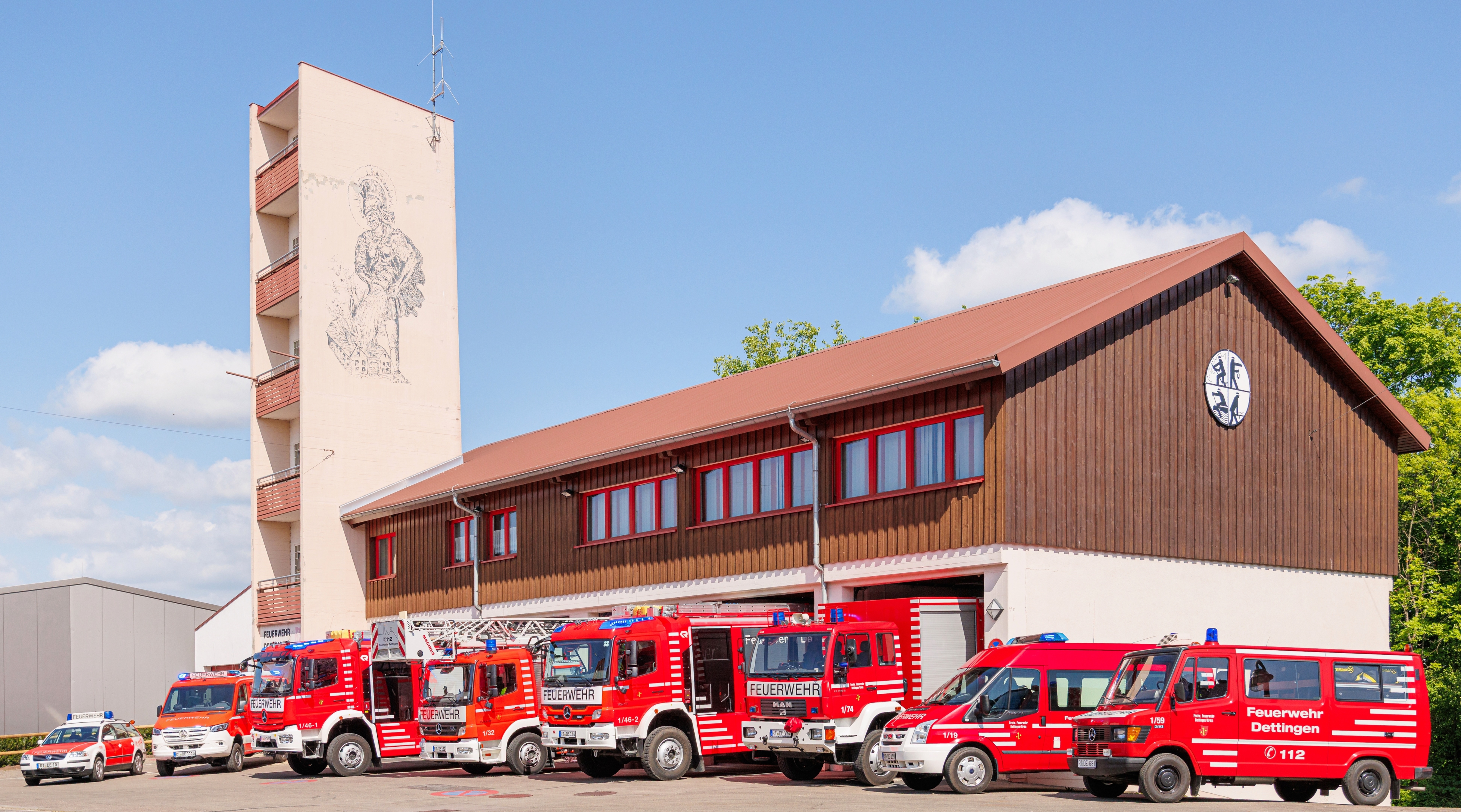 1968 erstellt und 1999 in Eigenleistung umgebaut und aufgestockt bietet unser Gerätahaus neben 6 Fahrzeuggaragen im EG eine weitere Garage/Lager im UG des Gebäudes. Interimsweise wurde 2024/2025 eine kleine Leichtbauhalle erstellt, die 2 weitere Garagen sowie genug Platz für Logistikmaterial und einsatzspezifische Beladung auf Rollcontainern bietet.